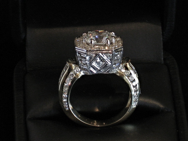 This Custom Remount featured a large 3 ct. center Diamond, then we added a vintage looking tapestry of smaller princess and baguette diamonds set on the sides, making this a real ‘stand out’ ring, with a one of a kind look and setting.